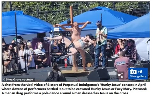 “They dress in sexualized perversions of religious garb, taunting the women religious who serve the poor in Southern California and around the world. In one infamous stunt, they tricked an archbishop into giving them the Eucharist – the most important sacrament of the Catholic faith – so they could defile it. This past Easter Sunday, the SPI put on an exhibition in San Francisco in which a performer dressed as Jesus carried a cross up a hill and then performed a pole dance on it.”