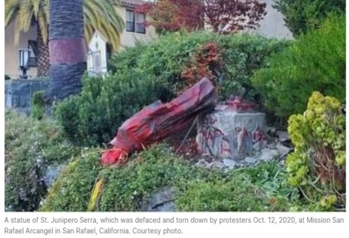 CALIFORNIA: On Oct. 12, 2020, five protesters defaced and tore down the statue of St. Junipero Serra on the grounds of Mission San Rafael Arcángel, the present-day home of St. Rafael Church in San Rafael, California.