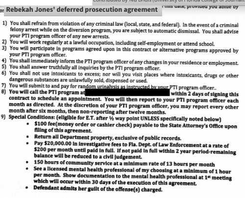 In January 2021, she was arrested and, in December 2022, she signed a plea deal admitting she had done the deed and agreeing to the terms shown in the deal (graphic above). Jones complained about the $20,000 fine. “I think it’s extortion. I think it’s an all-too common practice. It’s one of the reasons rich people don’t ever go to jail and poor people do because if you can’t pay the police a bribe, guess what, take you to trial.” She also claimed the charges had been dropped, but that will happen only if she can keep her nose clean for two whole years. Since she hasn’t managed to even keep a job for that long, it’s a big if.