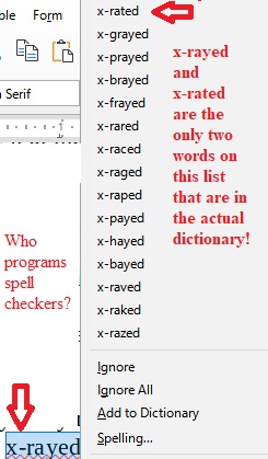 GRAMMY NOTES: I just had my LibreOffice Writer spell check pop this absurd list of possible “words” I supposedly might have wanted when I typed “x-rayed.” Being the compulsive word nerd that I am, I actually did look them up. Then, after I finished composing a long email, I copy/pasted it into gmail and got spelled checked on “x-rayed” again. Gmail’s list of “are you sure you didn’t mean?” substitutes was significantly shorter, but contained a number of the same “not real words” I’d gotten from LibreOffice. ::smh::