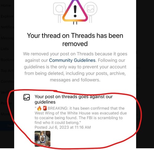 THREADS: On July 5, Meta launched “Threads”, its clone of Twitter. On July 6, The attempted post shown above was deleted less than 45 minutes after it went up and both Don Trump, Jr., and DC Draino had been tagged for censorship. If you try to follow either of them, you get a warning saying, “Are you sure you want to? This account has repeatedly posted false information that was reviewed by independent fact-checkers or went against our Community Guidelines.”