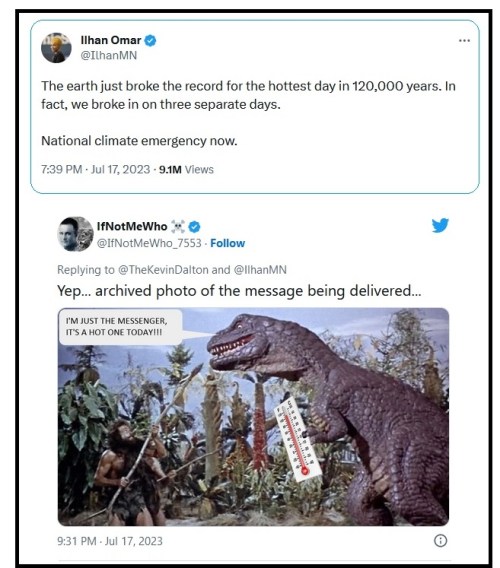 Matt Walsh remarked on Ilhan Omar’s idiotic tweet, “If you believe that we have precise daily temperature records dating back 120 thousand years, then this claim may seem credible. But if you are approximately smarter than a sea sponge then you know that this is hysterical bullshit.”