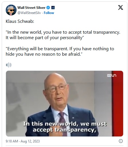 1984: Klaus Schwab, founder of the World Economic Forum, the Forum of the Young Global Leaders, and the Global Shapers Community, is a really big deal in the globalist community. But you know how it is with totalitarians. Rules for thee, but not for me. So when he says “total transparency,” what he really means is, “We will totally know all of your business, so if you step out of line, we can totally punish you.” Enter digital currency, social media tracking, and the Mark of the Beast.
