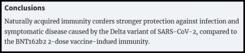 The study was designed to compare long-term protection from symptomatic breakthrough infection conferred by 2 doses of the Pfizer/BioNTech BNT162b2 vaccine (Group 1 = 16, 215 individuals) vs. long-term protection from symptomatic reinfection conferred by naturally-acquired immunity (Group 2 = 46,035 individuals who were never vaccinated).