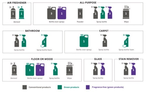 The researchers found that “across the group of 30 products tested here, green cleaning products emitted fewer VOCs and fewer hazardous VOCs than conventional products, and overall fragrance-free products had significantly lower emissions.”