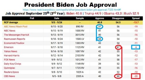 2024: The latest WaPo/ABC poll shows voter preference as Trump 51% vs. Biden 42%. WaPo tried to say this was an outlier, but according to Real Clear Politics, only one of the presidential approval polls shows a spread of less than 9 points, while the biggest spread is a whopping 20 points.