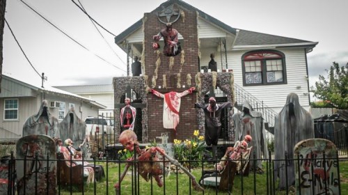 Blasphemy in Louisiana: The seasonal display in the photo above is on a house near Metairie, Louisiana. On the house is a blood-stained Satan holding the severed head of Jesus above a crucifix where the rest of His bloodied body hangs. Below is a sign saying, “He deserved it.” Above Satan is a Satanic symbol. Beside Jesus are bloodied and crucified bodies of a priest and a nun. In the yard are pews of bloody skeletal worshipers, ghouls, and tombstones. The stone on the right says, “Hillary’s Emails.”
