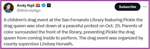 DRAG QUEEN STORY HOUR: CLICK https://twitter.com/MrAndyNgo/status/1717582300475449503 [:52] to see some video of the event. My fave comment from the X thread – “So they are canceling Halloween in a bunch of places for some risk to DEI? But those who play dress up every day, costumes etc, are being sent into the schools by the very same people canceling Halloween? Make it make sense...
