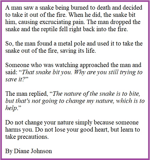 GRAMMY NOTES: “Do not lose your good heart, but learn to take precautions.” After decades of enduring abuse because I did not want to become like them, I did finally learn that loving myself required me to have boundaries. I now live by a three strikes rule. With each “bite,” I forgive but increase the distance. After three, I have to say “no more” lest I allow toxic persons to again suck up energy that could be more profitably used for others.