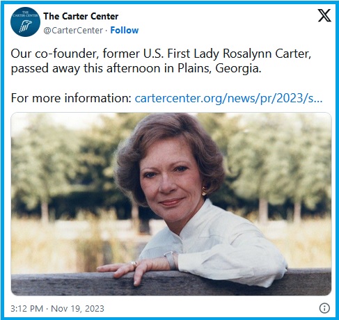 RIP: Former First Lady Rosalynn Carter, a passionate champion of mental health, caregiving, and women’s rights, passed away Sunday, Nov. 19, at 2:10 p.m. at her home in Plains, Georgia, at the age of 96. She died peacefully, with family by her side. She leaves behind her husband, who is 99.