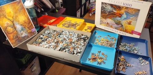 GRAMMY NOTES: A while back, Buzz dumped out both of these jigsaws into a pile on the floor. Mama decided today was a good day to sort the pieces and assemble the puzzles. Dearest and I did a 600 piece puzzle on Thanksgiving. It was such a fun and relaxing time, I am already shopping for a new one to do on Christmas.