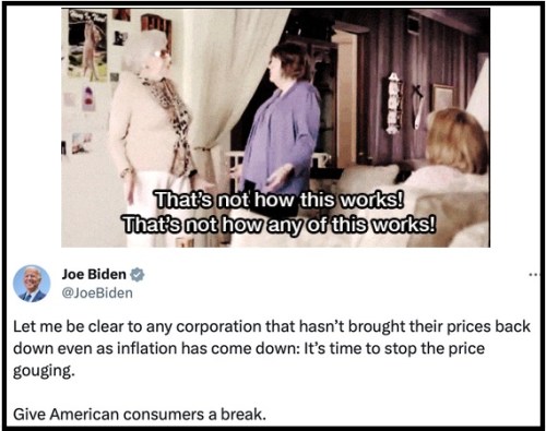 BIDENOMICS: Inflation measures how fast prices are rising. The fact that it has dropped to 3.2% doesn’t mean prices will drop. It just means they will continue rising at a slower rate than before.