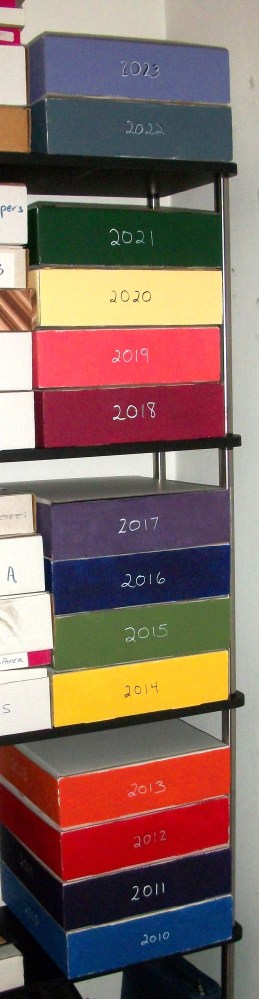 My first big goal was to catch up on organizing my scrapbook-y memorabilia. I have been scrapbooking since I was a kid. In 2009, I switched from making actual books (3-ring, zip-up binders, plastic page protectors) to just dumping a year’s worth of stuff into a 3” deep, white, cardboard box. I have covered some these with fabric, which makes them prettier and a lot stronger. This has been good for heavy stuff, like my impressive collection of sewing thread. But it takes time and uses a lot of fabric. So for scrapbooking, I have just been writing the year on each box with a Sharpie. It’s informative, but not pretty. Plus, I have a whole box of old and gloopy acrylic craft paint. So all week, I’ve been organizing and prettying up the 2010 to 2023 memory boxes. Yesterday, I finished! And, yay me, this pile meets all four of my SMS goals!