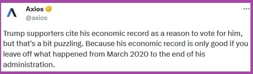Axios makes the case that a second Trump term would bring one of the strongest economies we’ve ever seen as long as we don’t see another ONCE-IN-A-CENTURY pandemic.