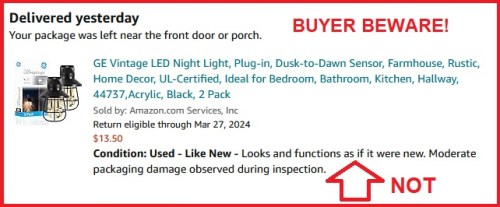 AMAZON: I opted to save a couple of bucks on this, because it wasn’t a gift, so I don’t care how the box looks. However, one of the two lights doesn’t work at all. I strongly suspect this box was a tad banged up, because it had already been returned at least once because that light doesn’t work and they just put it back on the shelf. Sadly, they’re going to be rewarded for their shoddy business practices, because I am not going to bother returning it. I really need the one that does work.