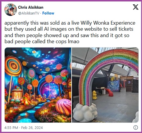 WILLY WONKA: This is real. Parents paid $40 a head to take their kids to this much-anticipated event in Glasgow last weekend. The AI-illustrated website promised an “Enchanted Garden,” a “Twilight Tunnel” and an “Imagination Lab.” The reality was a sparsely decorated warehouse that one customer said “looked like a meth lab.”