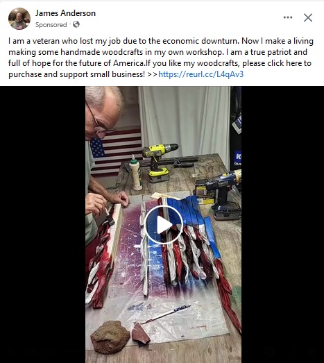 Clicking the link on the Facebook ad takes you to this web page, which claims to offer a wooden flag hand-made in the United States by a genuine military veteran for the low, low price of just $39.95. BUY NOW to get the Big Sale Price. Order TWO and get an even bigger discount! Frankly, you might as well flush the money down the toilet. At least then it wouldn’t go straight into the coffers of the scammers who will (a) harvest your personal data, (b) send you some cheap crap (or nothing), and (c) never, ever refund your money.