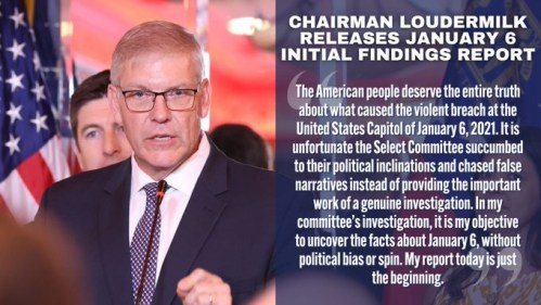 Chairman Barry Loudermilk (GA-11) stated: “The American people deserve the entire truth about what caused the violent breach at the United States Capitol of January 6, 2021. It is unfortunate the Select Committee succumbed to their political inclinations and chased false narratives instead of providing the important work of a genuine investigation. In my committee’s investigation, it is my objective to uncover the facts about January 6, without political bias or spin. My report today is just the beginning.”