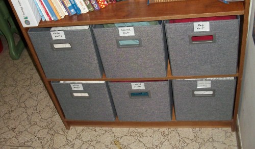 Over time, I have developed a list of Stuff Management rules that I use when I’m doing the Big Think part of a targeted project. I’ve also found a few online suppliers that have excellent organizing tools at reasonable prices. I got the Poppin bins (below) from The Container Store @ https://www.containerstore.com/welcome.htm for $14 each. They’re pretty, sturdy, and exactly the right size for my shelves.