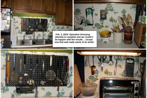 I’m going to talk about targeting again. But this time, it’s zeroing in on a very particular thing about your stuff that is annoying you. One of my first 2024 projects was to do something about my hanging kitchen utensils. The two strips of hooks were both under the upper cupboards and both had problems. One was a wedding present that was very poorly designed for the utensils that came with it. The other had accumulated more than double the things than there were hooks and all of it was bunched up in the same corner with two canisters of hole-less utensils and right next to my magnetic strip of knives. I was always having to move things to get what I wanted, then put back all the crap that had fallen off while I was at it.