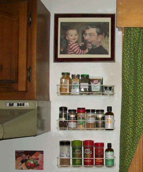 While I was saving my pennies for the Lowe’s purchase, I got the spice thing planned and started, then grabbed Mr. Handy on a day off and asked him to move the racks. He was so delighted with the result that he didn’t even remember that I have a little pile of things I took off that wall to deal with … some day. Not today. It’s in the “Round Tuit” place. And I’ll get to it. Eventually. But for now, I am too busy reveling in how easy it is to COOK!!! I hadn’t realized how stressful clutter can be until I got a couple of these targeted projects done. It’s really amazing.