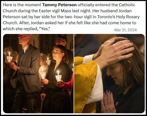 JORDAN PETERSON: Tammy Peterson, wife of conservative commentator and clinical psychologist Jordan Peterson, entered into full communion with the Roman Catholic Church during the Easter Vigil service. When asked if he could see himself taking the same step, Jordan said, “Well, I’m married to her, so whatever happens to her happens to me. It’s not like it’s separable.” Prayers for them both!