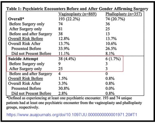 TRANS: The surgeons making big bucks hacking up healthy genitalia often tell parents that their offspring will commit suicide if they don’t sign off on the procedures. I looked at the single study they use to justify this and found it to be totally bogus. The rate of suicidal ideation is higher among teens with gender issues than among teens who are comfortable in their bodies. However, the rate of actual suicide attempts jumps dramatically following gender reassignment surgery.
