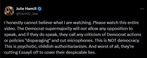 CLICK https://x.com/CAFamily/status/1806383162534355198 [15:04] to hear how the pros treated one of the cons when he attempted to present a reasoned argument against the proposal. I was intrigued to note that Assemblyman Essayli was the first Muslim elected to the California State Assembly. He is also obviously a Person of Color. But oooh, he is also a ::boohiss:: Republican who supports parental rights … so Off With His Mic. It gets worse.
