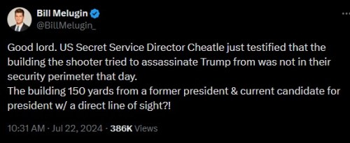 CLICK https://x.com/bennyjohnson/status/1815419656519229738 [6:19] to hear AOC object to the idea that it’s going to take sixty days to get a report on the security failures that permitted Crooks to shoot at one of the most important men in our nation.