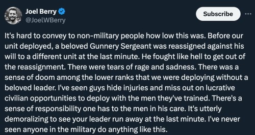I can empathize with what Joel Berry said (above). I once knew an Army officer who was forced to go to Cornell for a Master’s degree just before the unit she had commanded for several years deployed to Iraq. I won’t detail the level of emotional distress it caused, because it’s not my business to share. But it was bad.