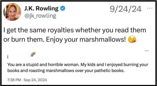 ROWLING: Personally, I wouldn’t roast marshmallows over burning books. There’s no telling what toxins are in the smoke … from the ink, glue, etc. Not from the ideas the author espouses but did not include in her wonderful stories. ::smh:: I mean … at least her books are actually fun and interesting, unlike leftist stories that constantly beat you over the head with their ideologies.