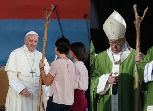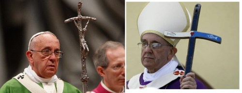By contrast, the papal staff (known as a ferula, which is Latin for rod) has cross or crucifix on top. There is no set standard; the photo shows Pope Francis with two different ones.