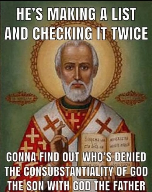 Bishop Nicholas of Myra, whose person became the foundation for Saint Nick/Santa Claus, was at the Council of Nicaea, where he is said to have been a staunch opponent of Arianism. There is an old legend that he felt so strongly about the matter that, during the council’s deliberations, he actually slapped Arius. However, this story is from more than 1,000 years after Nicholas died. It makes for some funny Catholic nerd memes, but I find it difficult to believe it ever happened.