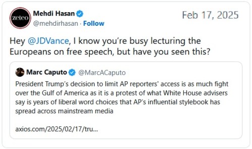VANCE: J.D.’s reply – “Yes dummy. I think there’s a difference between not giving a reporter a seat in the WH press briefing room and jailing people for dissenting views. The latter is a threat to free speech, the former is not. Hope that helps!” P.S., I hope y’all took the time to watch J.D.’s awesome speech!