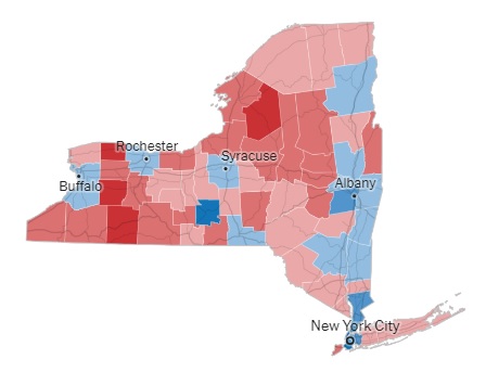 NEW YORK: My home state is shifting right. Republicans just gained over 72,000 voters over the last month (Republican: +23,311 and Democratic: -49,583). Dearest has his work cut out for him. He has been active with our local and county Republican groups for many years. See that dark blue blot in the center of the state? That’s us.