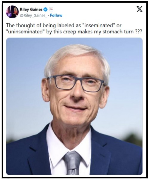 WISCONSIN: Gov. Tony Evers (D) says he supports a Democrat Senate bill that would replace the word “mother” with the word “inseminated person” and replace the word “husband” with the word “spouse.” “Inseminated” is how farmers talk about dairy cows. IMO, this is one very deliberate step lower than “birthing person” in the Left’s satanic drive to destroy the dignity of women and the sanctity of the family.