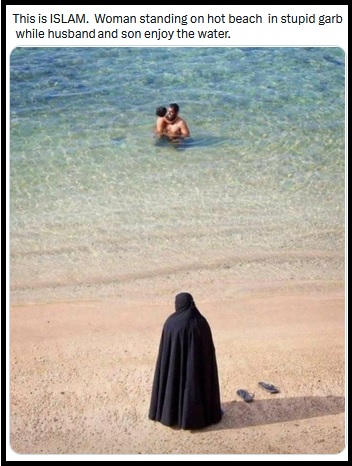 ISLAM: I saw a woman at JoAnn’s dressed like this at once. It was mid-summer; husband and toddler were in light clothing and sandals. Wife was trying to decide if fabric weight would suit by feeling it … while wearing black knit gloves. There weren’t even any other men in the store.