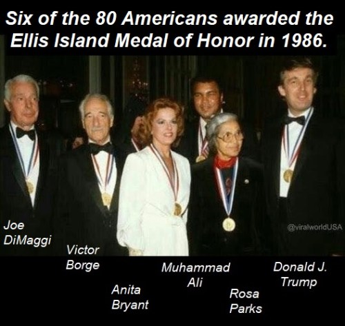 ELLIS ISLAND MEDAL of HONOR: Founded in 1986, the Ellis Island Medals of Honor are presented annually to those who have shown an outstanding commitment to serving our nation. A ceremony and gala dinner are held each May on Ellis Island in the Great Hall where immigrants were once processed. All branches of the United States Armed Forces traditionally participate. Both the United States House of Representatives and United States Senate have officially recognized the Ellis Island Medals of Honor, and each year’s recipients are read into the Congressional Record. The photo shows six of the 80 Americans who received the award in its first year. Other familiar names from that year’s list include Cesar Chavez, Claudette Colbert, Walter Cronkite, Zbigniew Brzezinski, John Denver, Kirk Douglas, Helen Hayes, Coretta Scott King, Martina Navratilova, Jacqueline Kennedy Onassis, Arnold Palmer, and Barbara Walters.