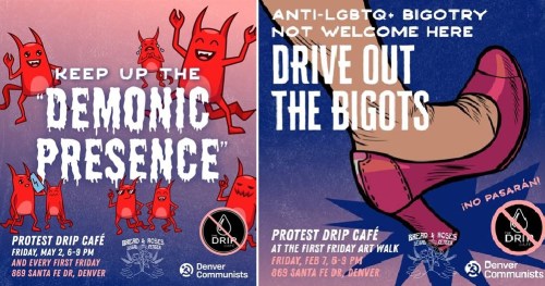 The Denver Communists, who have explicitly stated their goal is to the “anti-gay hate café” out of business, regularly schedule noisy protests, during which they harass customers and staff with signs and bullhorns. They have distributed flyers (examples above) slandering the business, vandalized the property, and spray-painted an image of a KKK member hanging on the café’s door.