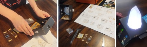 GRAMMY NOTES: Buzz (who isn’t “Lil” any more!) built a color mixing conductivity device from a kit and will be doing experiments with it to understand how mixing colors with light is different from mixing colors with pigments. The right hand photo shows the device with red, green, and blue all on at the same time. With pigments, that would make a muddy brown; with lights, it makes white.