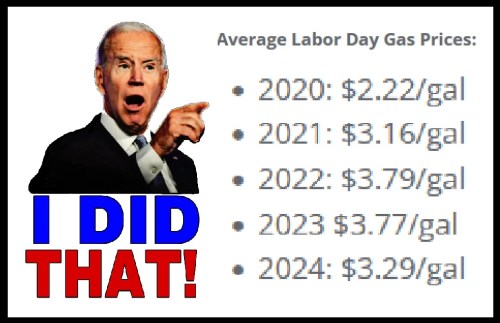 GAS PRICES: They went up every year “Biden” was running things. Analysts predict this Labor Day, the average price will be $3.15/gallon.