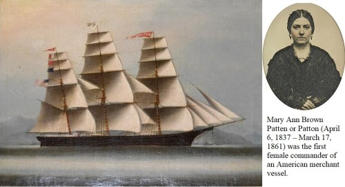 HISTORY: In 1856, Mary Ann Brown Patten was only 19 years old when she boarded the clipper ship Neptune’s Car with her husband, Captain Joshua Patten. When her husband fell ill and collapsed, Mary took command and, using the navigation skills her husband had taught her, safely guided the ship and her entire crew for a grueling 56 days. After rounding the treacherous waters of Cape Horn, Neptune’s Car arrived in San Francisco with her full crew intact and her temporary captain eight months pregnant.