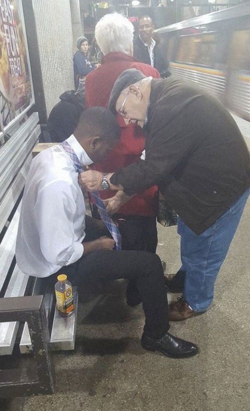 EVERYDAY HEROES: The young man sitting down was struggling with his tie, so the older gentleman showed him how, then watched as the young man repeated it to show he had it. The photo was taken by a bystander.