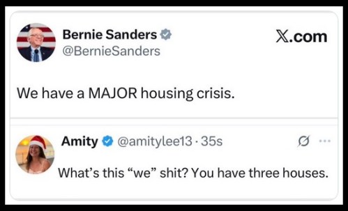 HYPOCRITE: CLICK https://x.com/WallStreetApes/status/1915781743027904568 [:18] to hear him say, “There are half a million people in The United States who are homeless, and you got billionaires who have more money than they can spend in a thousand lifetimes. How many homes do you need?” Bernie Sanders “Do I own 3 residences? Yeah. I do.” He used to say “millionaires and billionaires.” Then he became a millionaire and now he only rails against the latter.