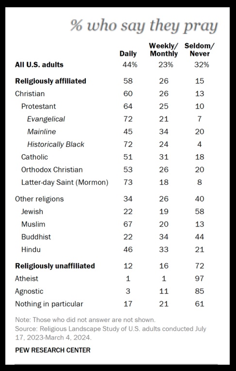 HOPE: According to new data from Pew Research Center’s Religious Landscape Study, 44% of U.S. adults say they pray at least once a day while another 23% say they pray weekly or a few times a month. The oddest result on the poll are the 2% of self-proclaimed atheists who claim to pray. ??