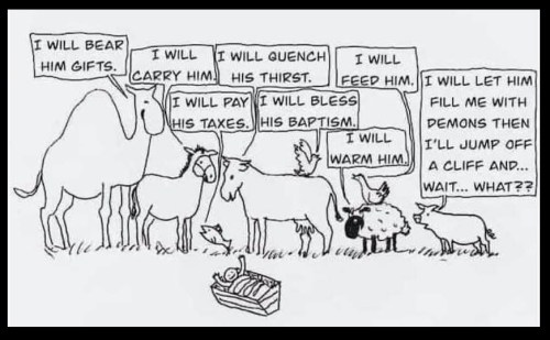 THE REASON FOR THE SEASON: Mangers in Bethlehem were not wooden bins to hold hay. The animals ate grass all day, so were given only water at night. And since wood is scarce, but limestone is not, the water troughs were (and are) carved from stone. So both the Baby Jesus and our Crucified Lord were wrapped in cloth and laid to rest in a stone box.
