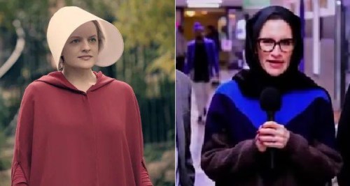 On the left is a shot from The Handmaid’s Tale, a dystopian novel/television series/movie/opera/graphic novel about a repressive, patriarchal, theocratic society. The red cloaks and white winged bonnets are routinely worn at anti-Christian protests.