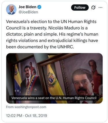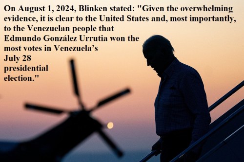 CLICK https://x.com/EstieMaddie/status/2007927785738920091 [1:06] to hear what Biden did following Maduro’s theft of the presidential election. On August 1, 2024, Blinken stated: “Given the overwhelming evidence, it is clear to the United States and, most importantly, to the Venezuelan people that Edmundo González Urrutia won the most votes in Venezuela’s July 28 presidential election.”