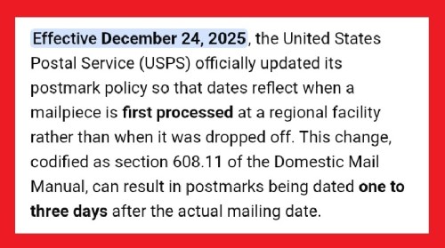 USPS: If you have mail that requires an accurate mail date on the postmark, do not drop it in a blue box. Rather, go to your local post office, stand in line, and have it hand stamped by an actual person. The service is free and will give time sensitive items (e.g., tax returns, ballots, payments that may incur a late fee) the actual mailing date. If you really, really need the piece mailed securely, use Certified Mail. It costs more, but will not only get the sent date verified, but also provide proof of delivery.