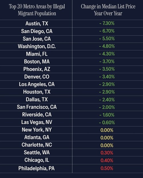 BORDER: In December, 14 of the top 20 metro areas with the largest illegal migrant populations, home list prices declined year-over-year. The three metro areas that saw modest price increases are all so-called “sanctuary cities.”